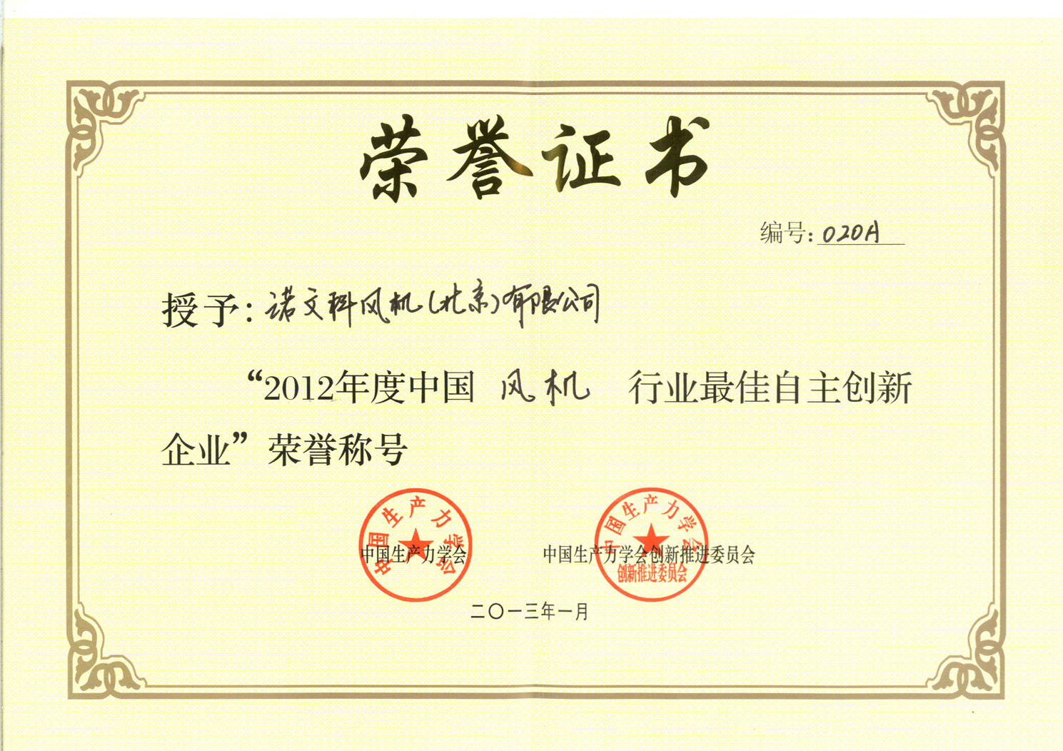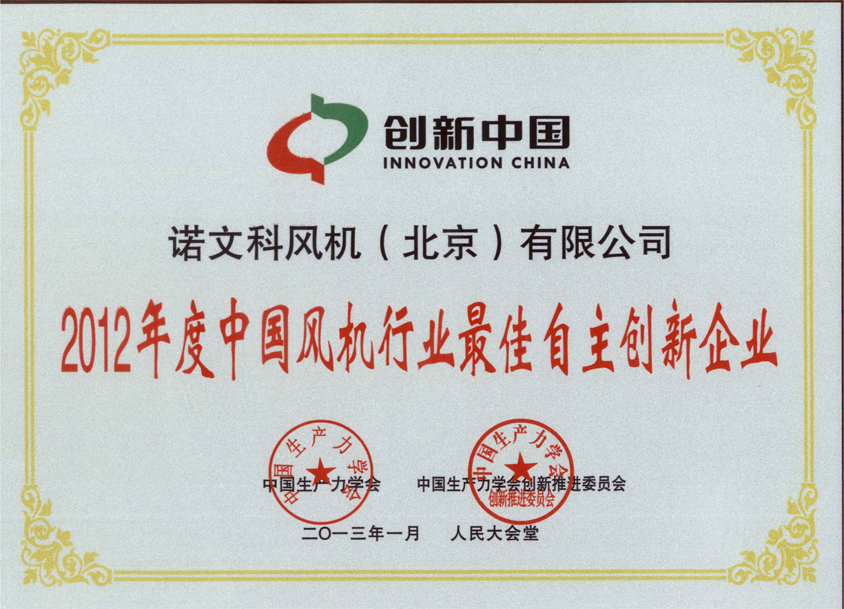诺文科喜获“2012年度风机行业最佳自主创新企业”荣誉称号
